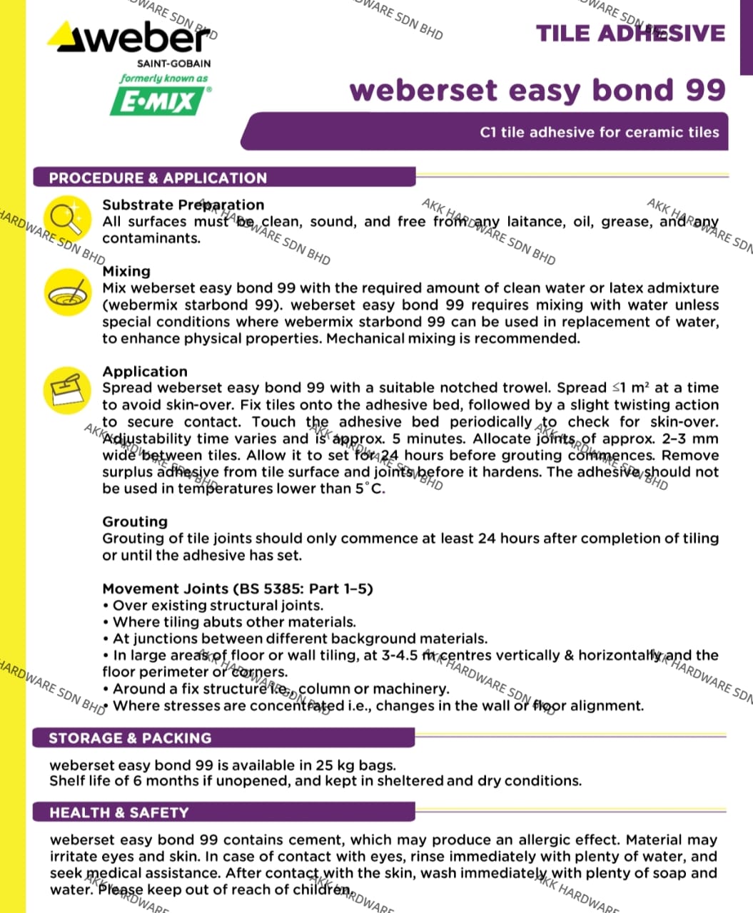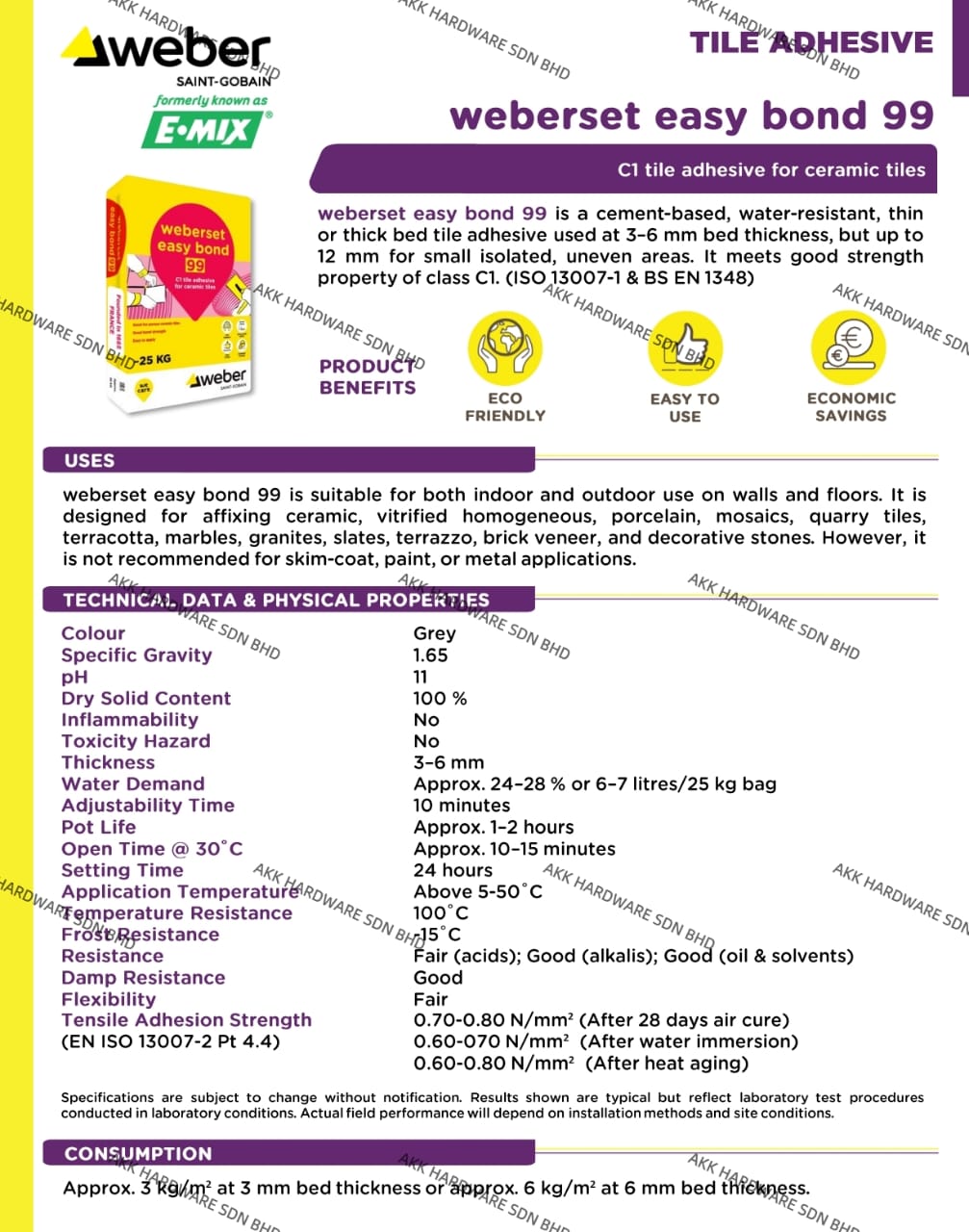 Description: WEBERSET EASY BOND 99 Is A Cement-Based, Water-Resistant Tile Adhesive Designed For Both Thin And Thick Bed Applications. It Is Classified As A Category C1 Adhesive Under The Standard