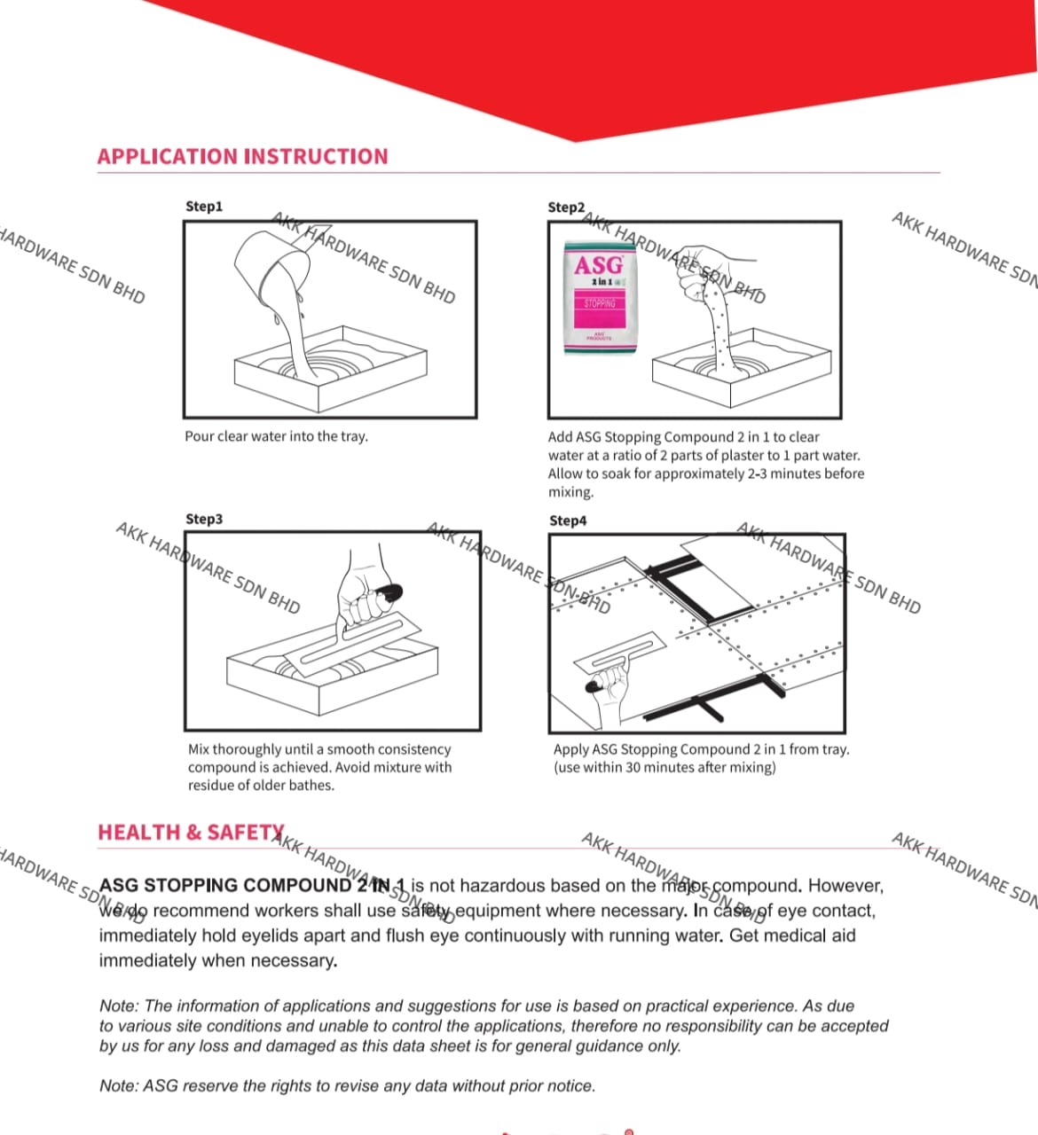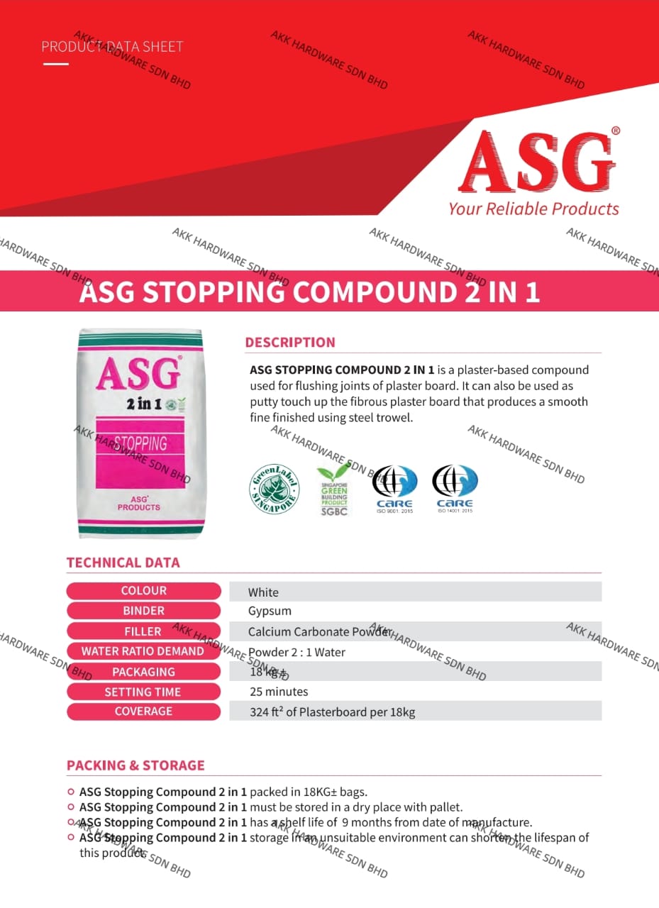 Description: ASG Stopping Compound 2 In 1 Is A Plaster-Based Finishing Compound Designed For Use With Plasterboard Systems. Specifically, It Is Formulated To Flush Joints Between Fibrous Plasterboards, And Also Acts As A Putty For Touch-Up Work To Achieve A Smooth, Fine Finish Using A Steel Trowel.