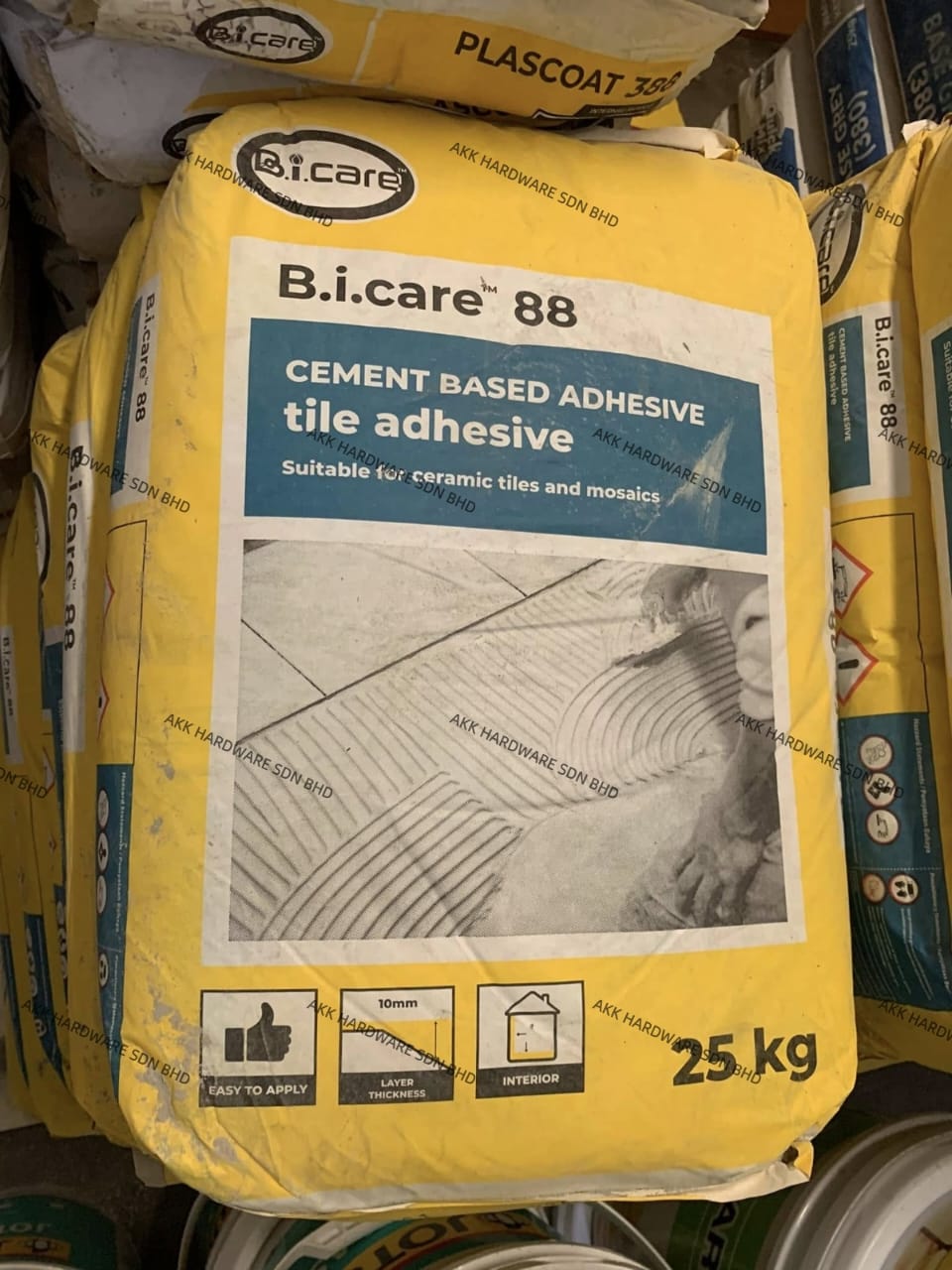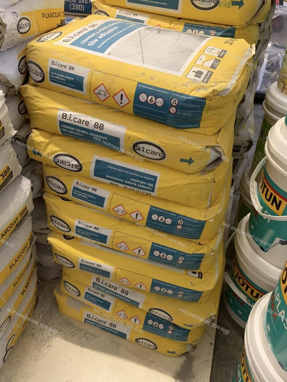 B.I Care 88 is a high-performance cementitious tile adhesive. It is used for bonding various types of tiles to floors and walls in construction projects, particularly in Malaysia.