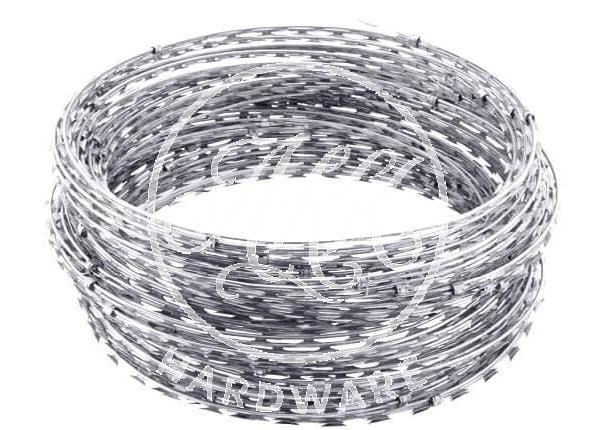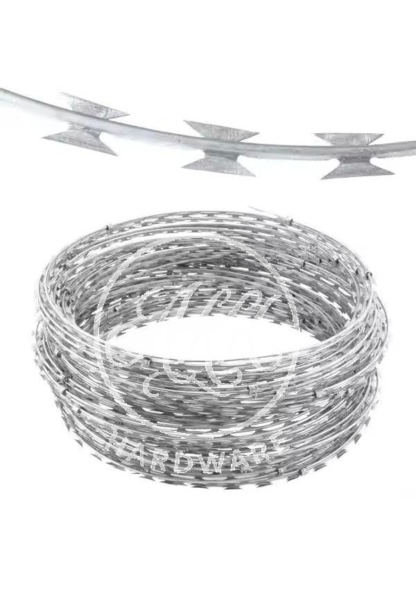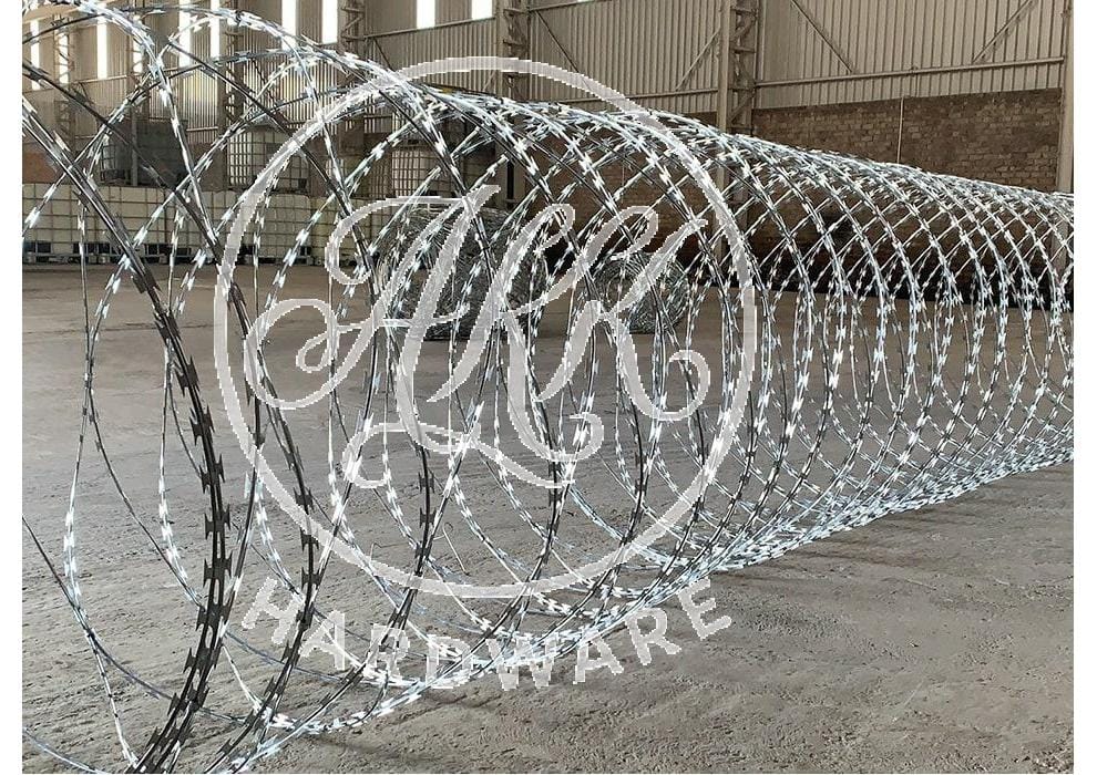 CONCERTINA RAZOR BARBED WIRE IS A HIGH-SECURITY BARRIER MADE OF SHARP STEEL TAPE COILED INTO A CONCERTINA SHAPE (ACCORDION-STYLE). THIS DESIGN PROVIDES A FORMIDABLE PHYSICAL AND VISUAL DETERRENT FOR MAXIMUM SECURITY APPLICATIONS.