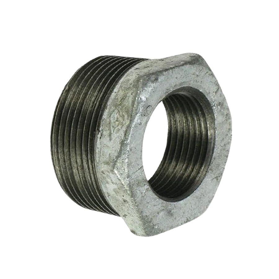 A galvanized iron reducing fitting with male threads outside and female threads inside.