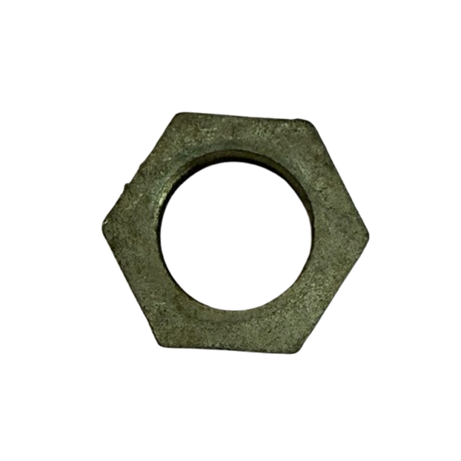 A galvanized iron nut used to secure and lock pipe fittings in place.
