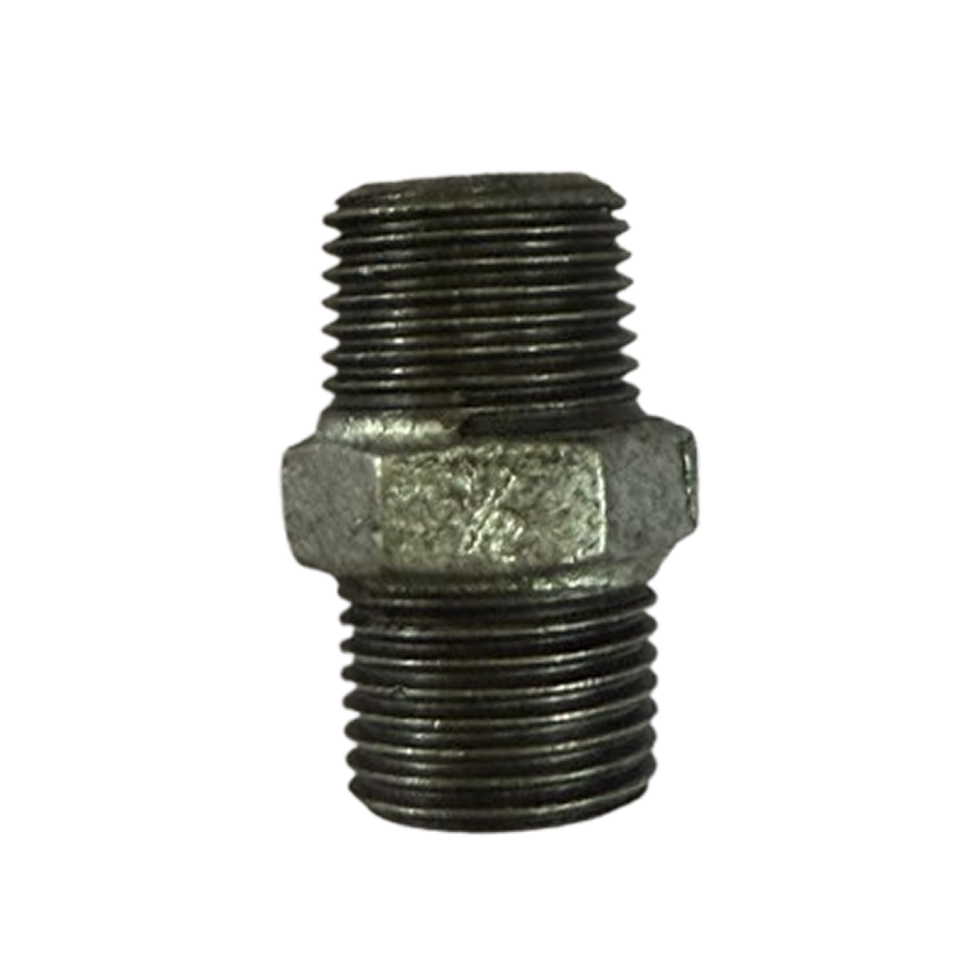 A galvanized iron pipe fitting with male threads on both ends.