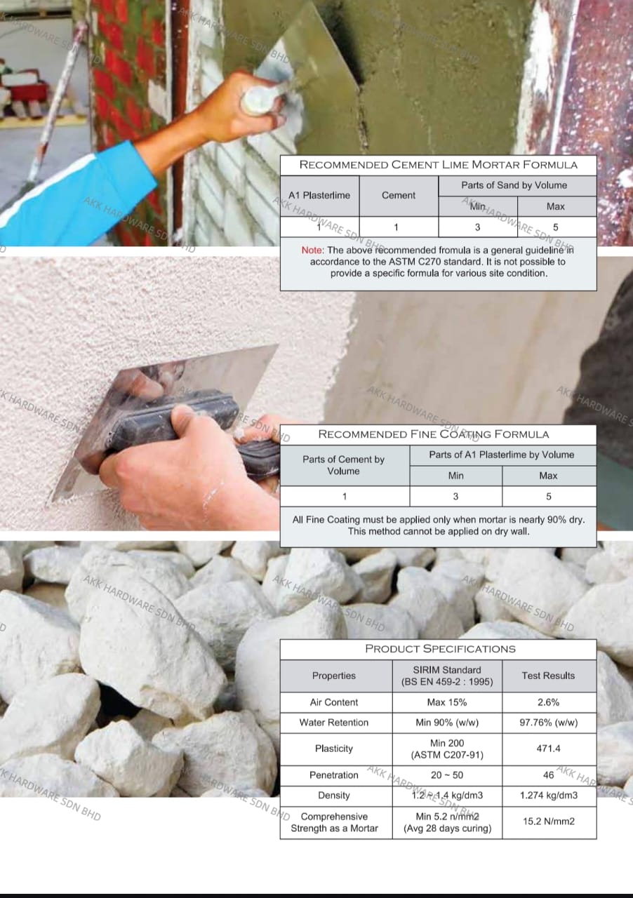 Description: Kapur A1 is a high-quality agricultural and construction lime (calcium carbonate-based material) known for its purity, fine texture, and effectiveness. It is commonly used to neutralize acidic soils, improve soil fertility, and enhance crop growth in agriculture. In construction, it is used as a binder in mortar, plaster, and cement stabilization. Kapur A1 is readily soluble in water, allowing for easy application and fast-acting results.