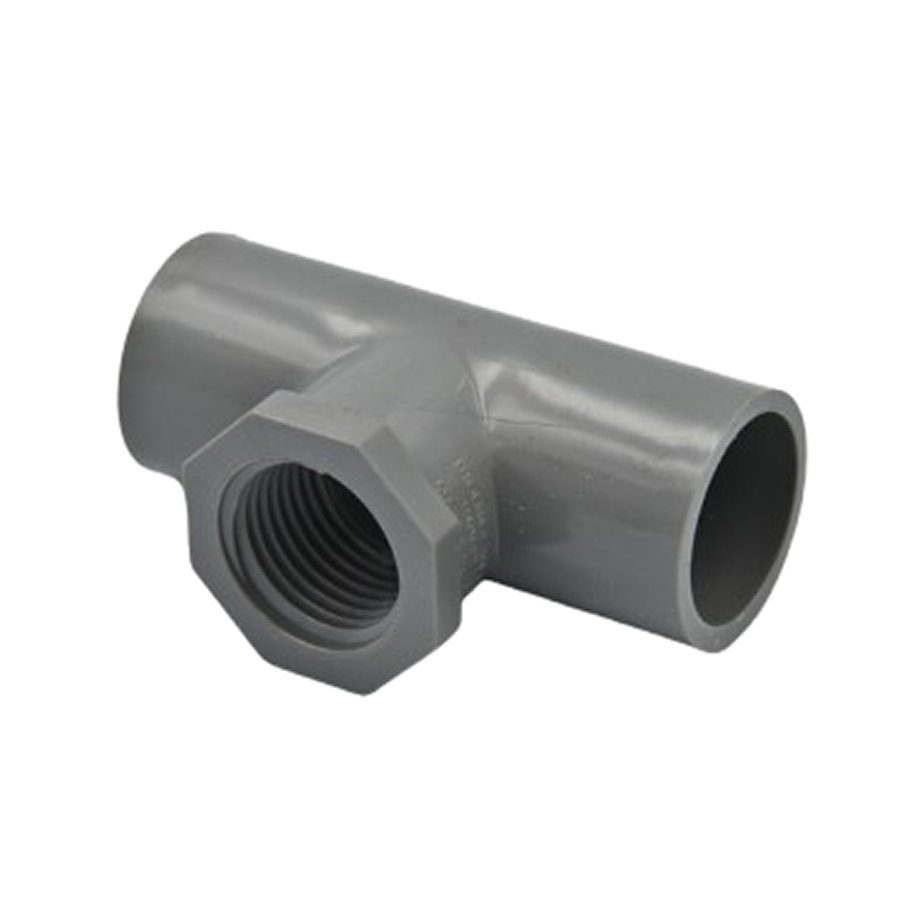 Description: PVC P.T. Tee (Plain Thread Tee) connects three PVC pipes together at 90°, with one outlet threaded for easy attachment to fittings or accessories.