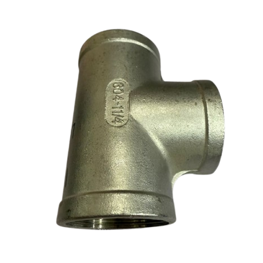 Stainless steel pipe fitting used to combine or split fluid flow, with three openings (one inlet and two outlets or vice versa).